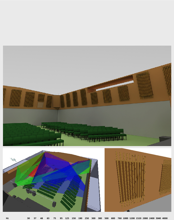 In this project, I designed panels to improve acoustics in an existing church worship space. I analyzed the sound in the room and determined the frequencies that were forming standing wave patterns, causing the sound to be much louder in some locations. I also determined that the higher frequencies were slapping off the walls, creating an unpleasant reverberation. To solve these problems, I designed and organized the construction of panels to be mounted on the walls of the room. The panels are backed with acoustical foam to deal with the standing waves, while in the front, long strips of wood break up the higher frequencies, preventing the harsh slap without eliminating all reverberation.